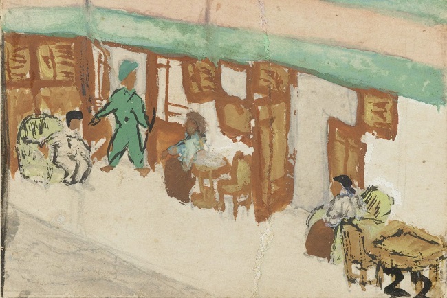 Water colour sketch by Mohammad Toha Adimidjojo, of Dutch soldiers searching Toha's house looking for his brother who has become a guerrilla. The man wearing a blue surjan is Toha’s father (1949) / Collection Rijksmuseum.
